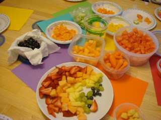 momstown is focused on MY SENSES this month, so our Junior Chefs brought in their favorite fruits and vegetables. We were able to see, smell, touch, and taste them. The fruits and vegetables were discussed by color starting with red then orange, yellow, green, blue, and purple. As we talked about the fruits and vegetables of a particular color, we would move those fruits/veggies to the corresponding color construction paper. Once we made our way through the purple fruits and veggies, it was time for tasting. Each child (with help from mom) sampled every fruit and vegetable on the table.